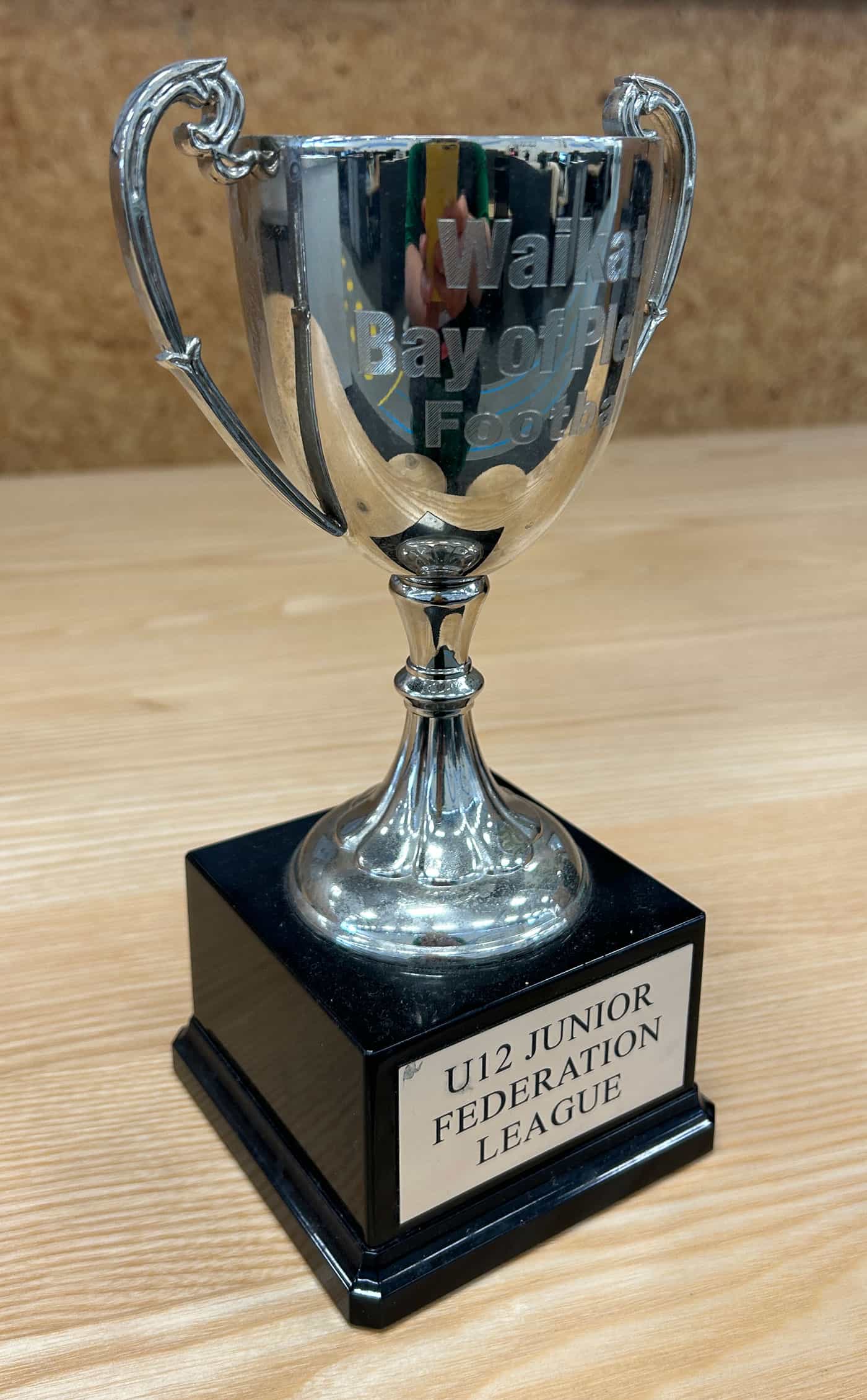 Liam Lancaster, Tokoroa's President (pictured right), was on hand to accept the trophy from WaiBOP Football's Chief Executive, Karyn Walters (pictured left).