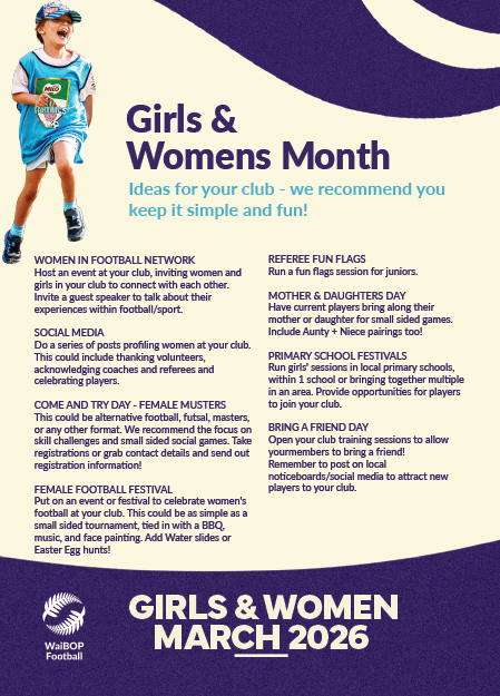 | ONLINE | NZF Referee Webinar – WaiBOP referees Anna-Marie Keighley and Sarah Jones will feature in this webinar, targeted at those in the community who aspire to progress their refereeing journey. There will be a panel discussion with current female referees about how to get started in community refereeing including advice on seeking a trusted mentor to offer guidance, feedback and support. Register here: NZF Referee Webinar |